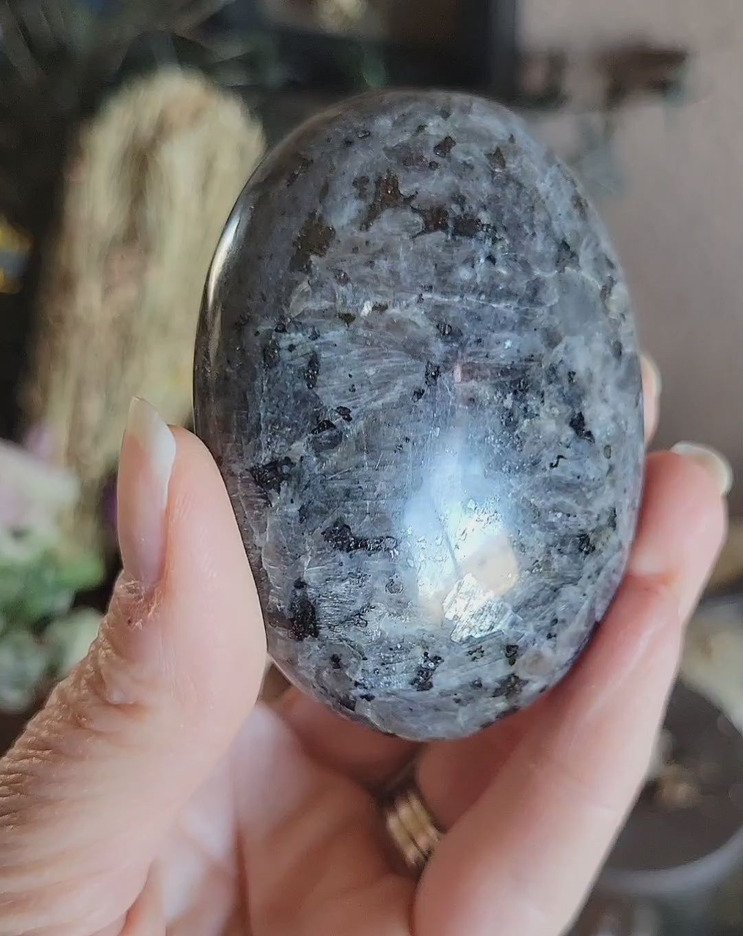 The listing is for (1) ONE randomly selected Larvikite palm stone approx. 2.00-2.60 inches.